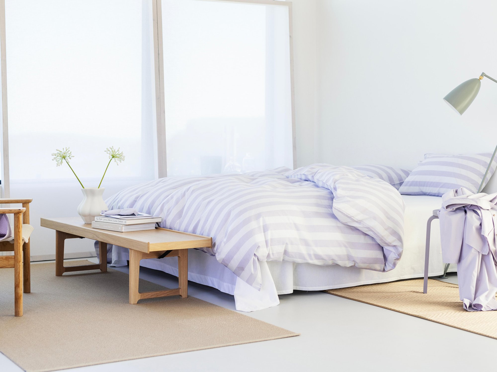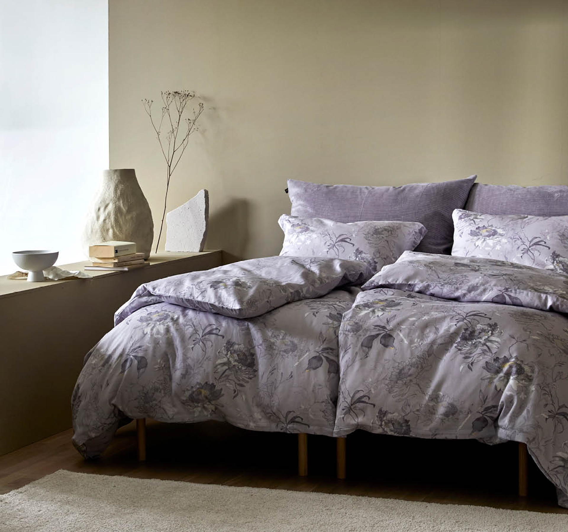 Lavendel er en farge som er perfekt å kombinere med hvitt for et rent, moderne uttrykk. Karma - et sengesett i ekstra fin bomull fra gir et lekkert spill mellom hvitt og lavendel. Vil man leke med et litt mer jordlig utseende rundt den lekre lavendelen er brune og oker toner et virkemiddel.