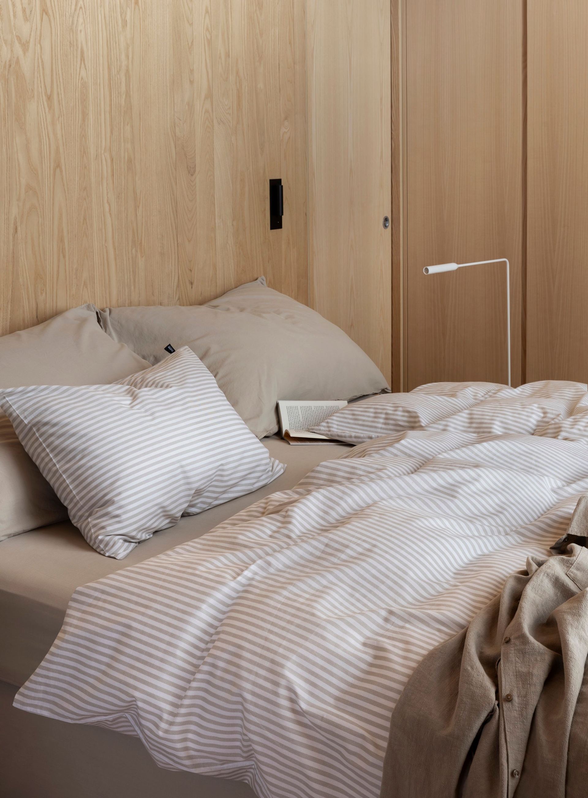 Glad i både striper og beige? Da vil du like sengesetteme Tor i ekstra fin bomull og Eilert i deilig krepp. Miks og match med Frøya beige laken og ekstra putetrekk.