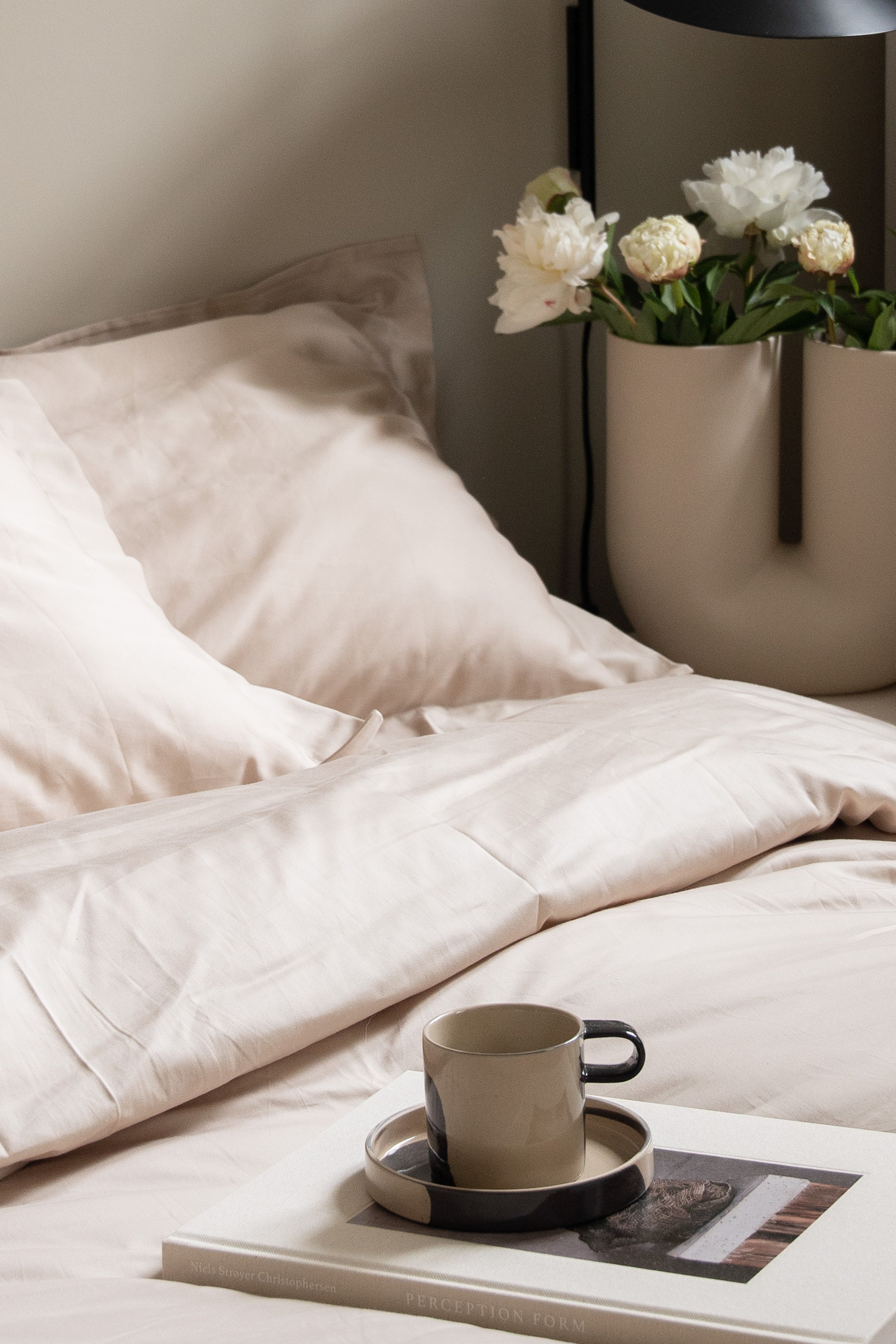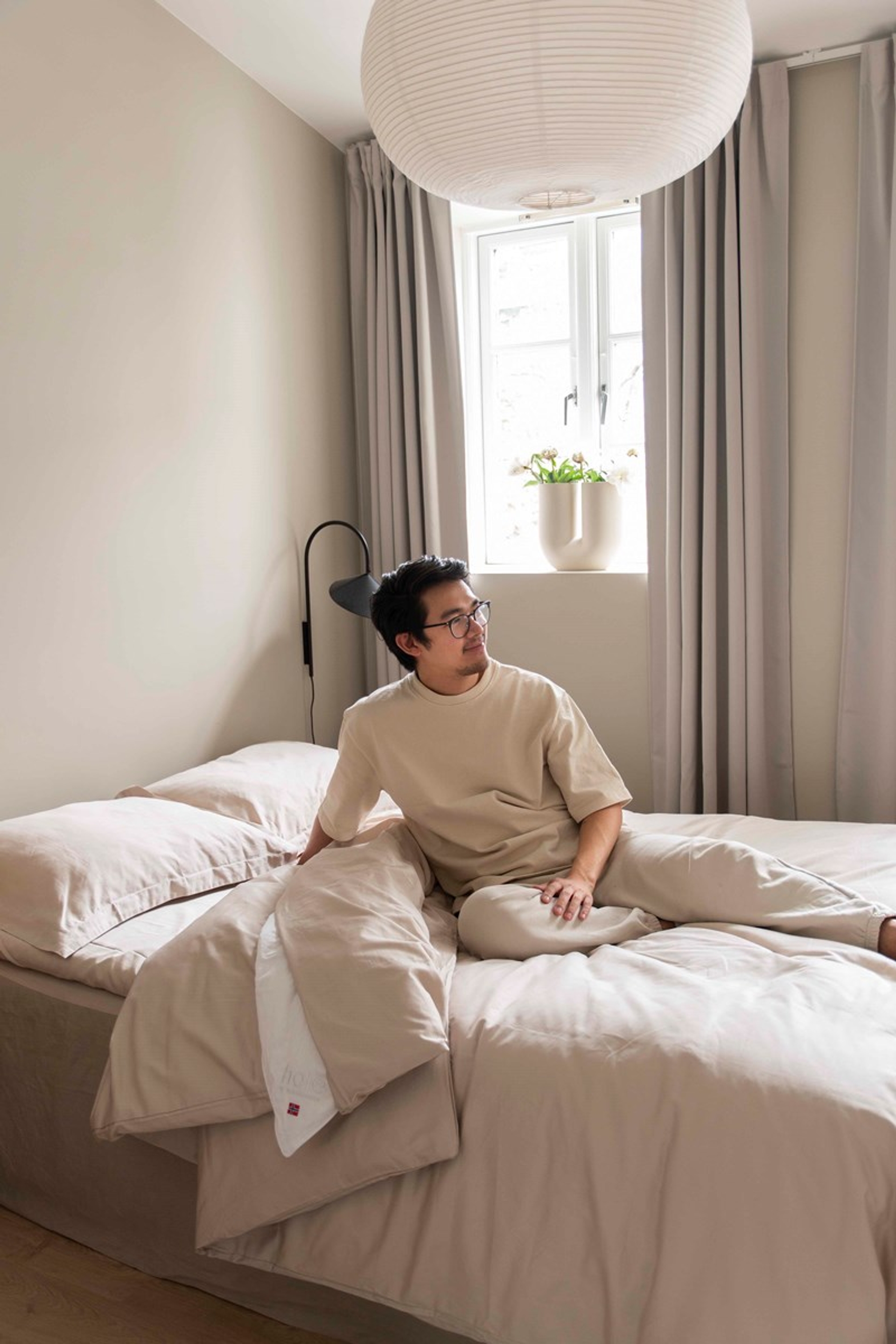 Elsker beige nyanser både på vegger og sengetøy. Det beige sengetøyet fra Høie i sateng er helt perfekt! Om høsten bruker jeg å innlemme mørkere jordtoner. Og om våren lysere. Det kan være fargen på sengetøyet eller pyntegjenstander. Om sommeren foretrekker jeg å bruke enten sateng eller lin. Sateng føler jeg gir en avkjølende effekt når den treffer huden, noe som er så deilig! Lin er også deilig fordi det er luftig. Helt nydelig om sommeren.