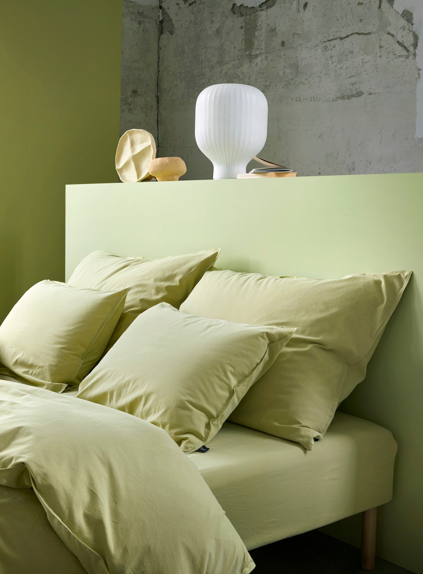 Sengesettene Ragna og Tor i fargen dempet lime passer perfekt å matche med Frøya i samme farge. Gå for laken og hotellputetrekk i den spreke fargen for et gjennomført og innbydende soverom.