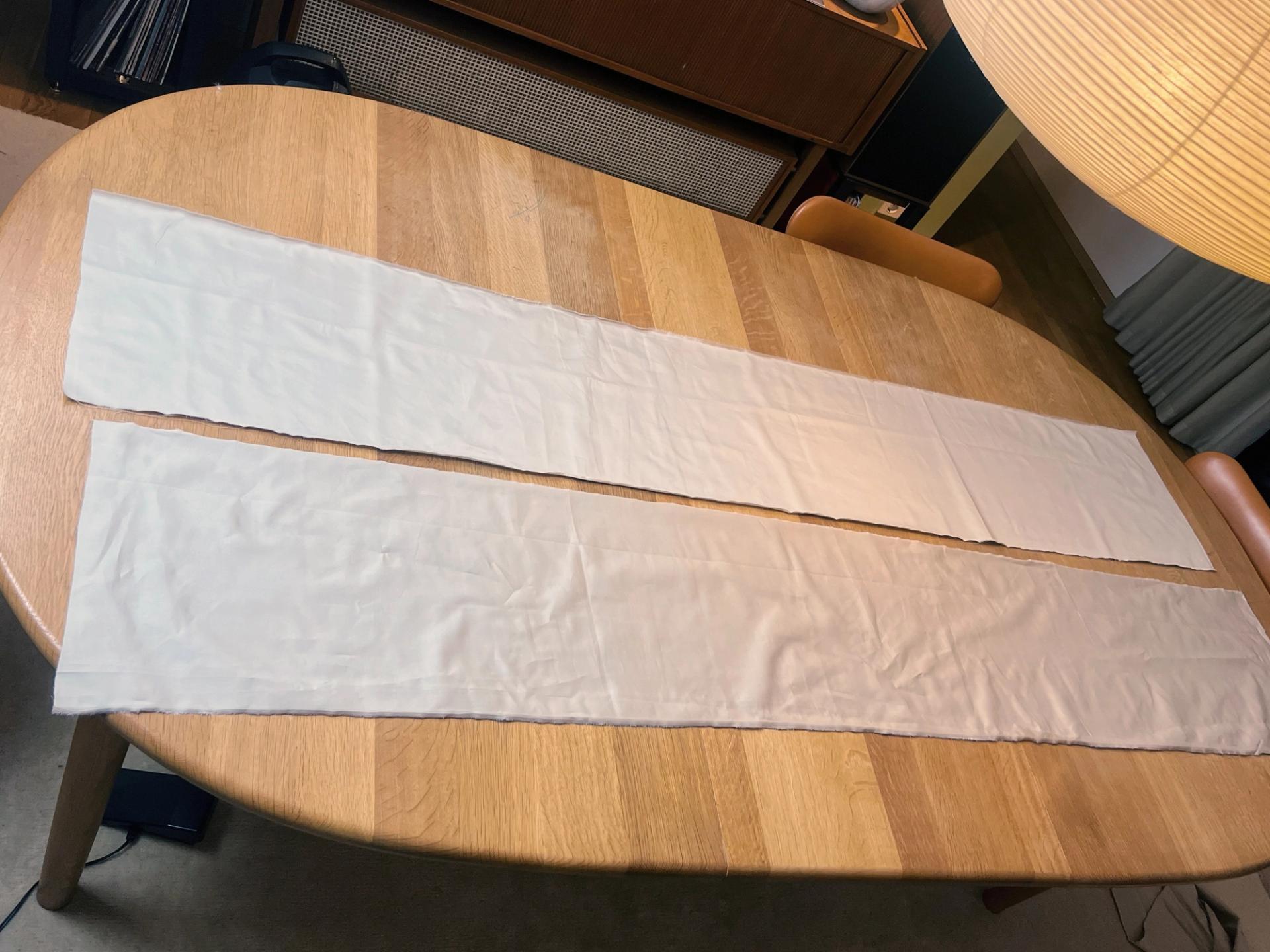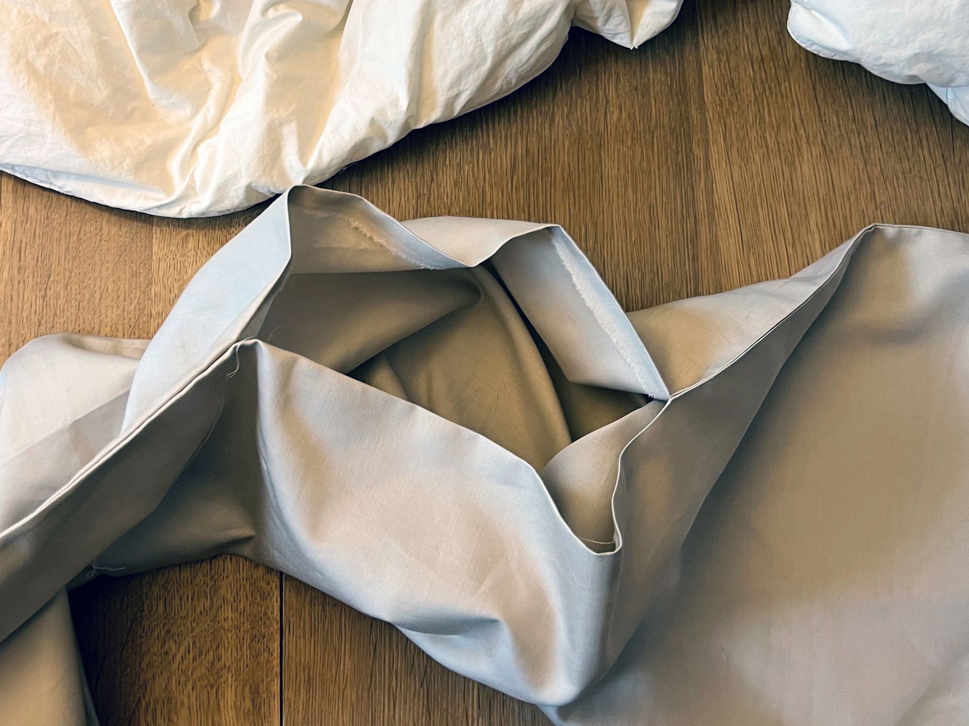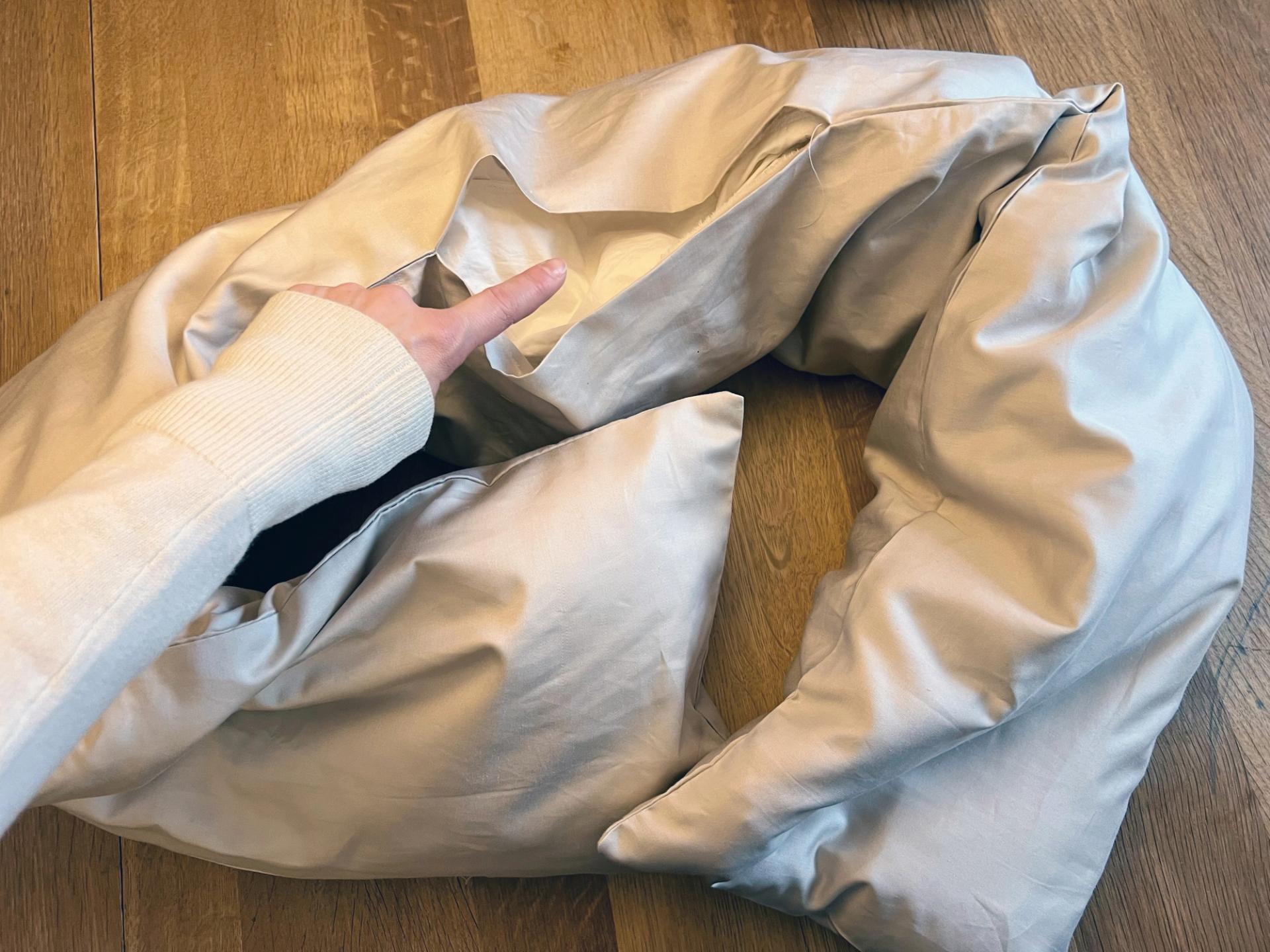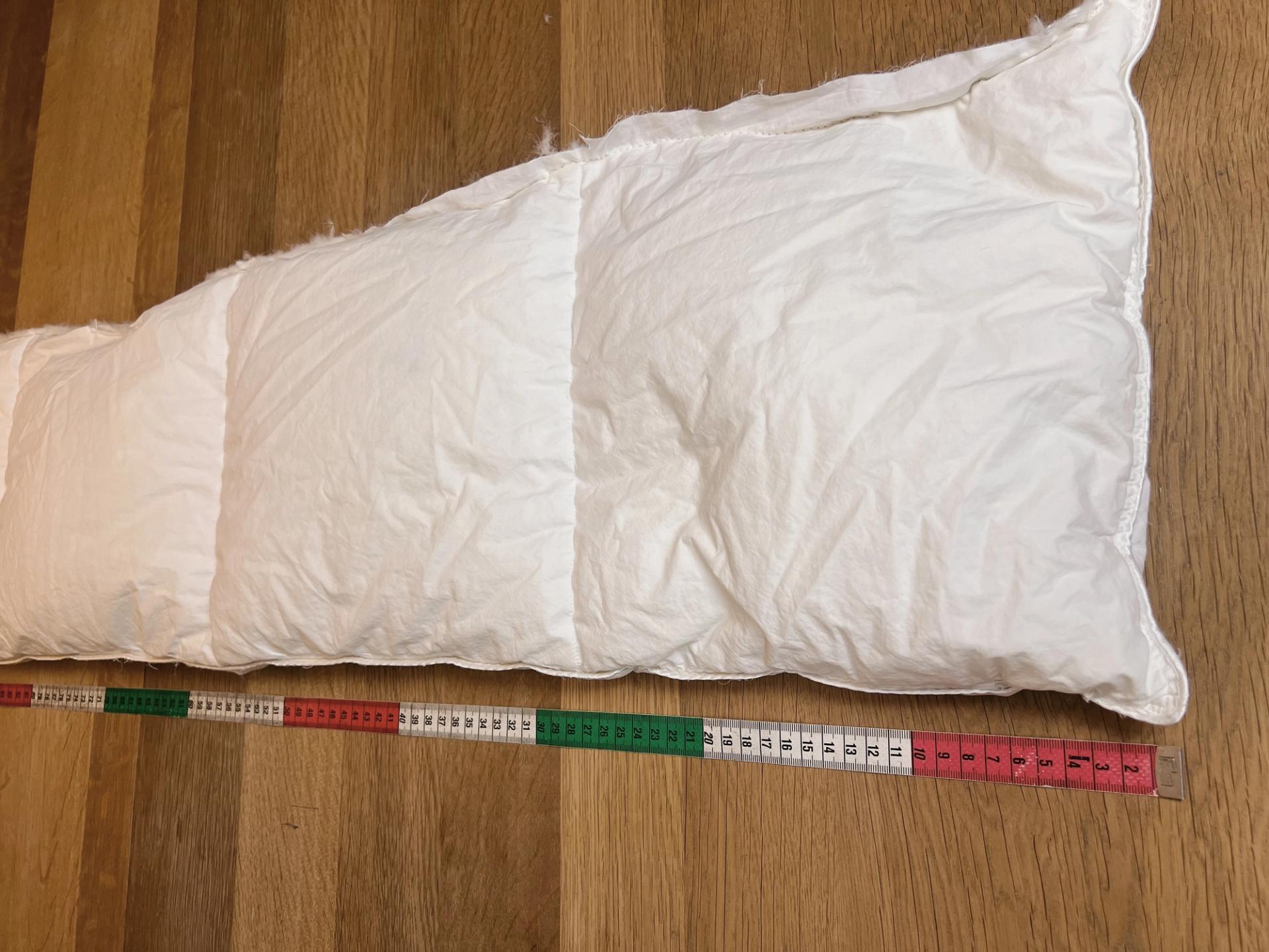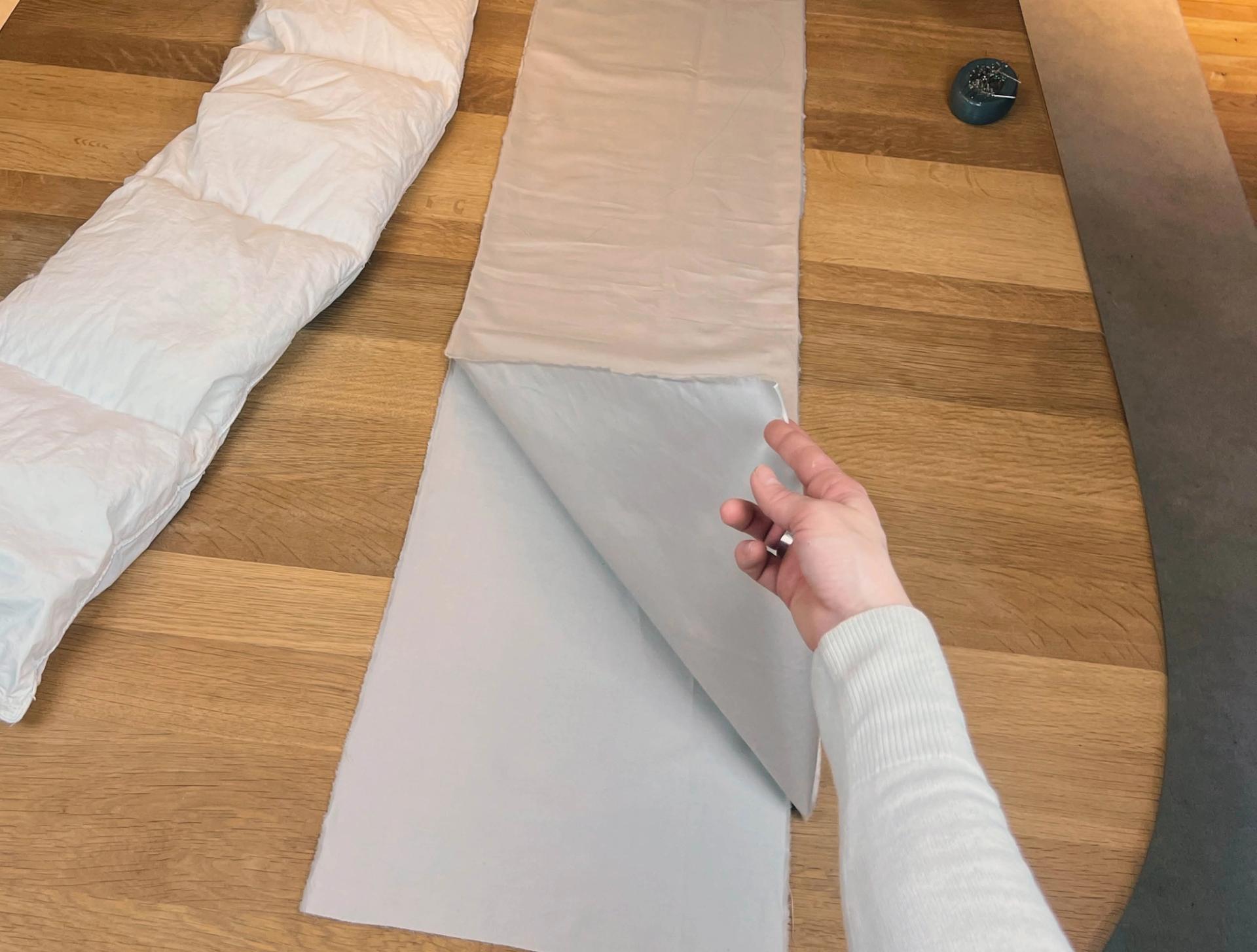 Klipp mellom de to sømmene. Bruk gjerne en støvsuger til å støvsuge opp den dunen som kan komme ut av dynen mens du klipper. Nå har du et dunsskjerf uten trekk. Så nå skal vi klippe ut trekket.