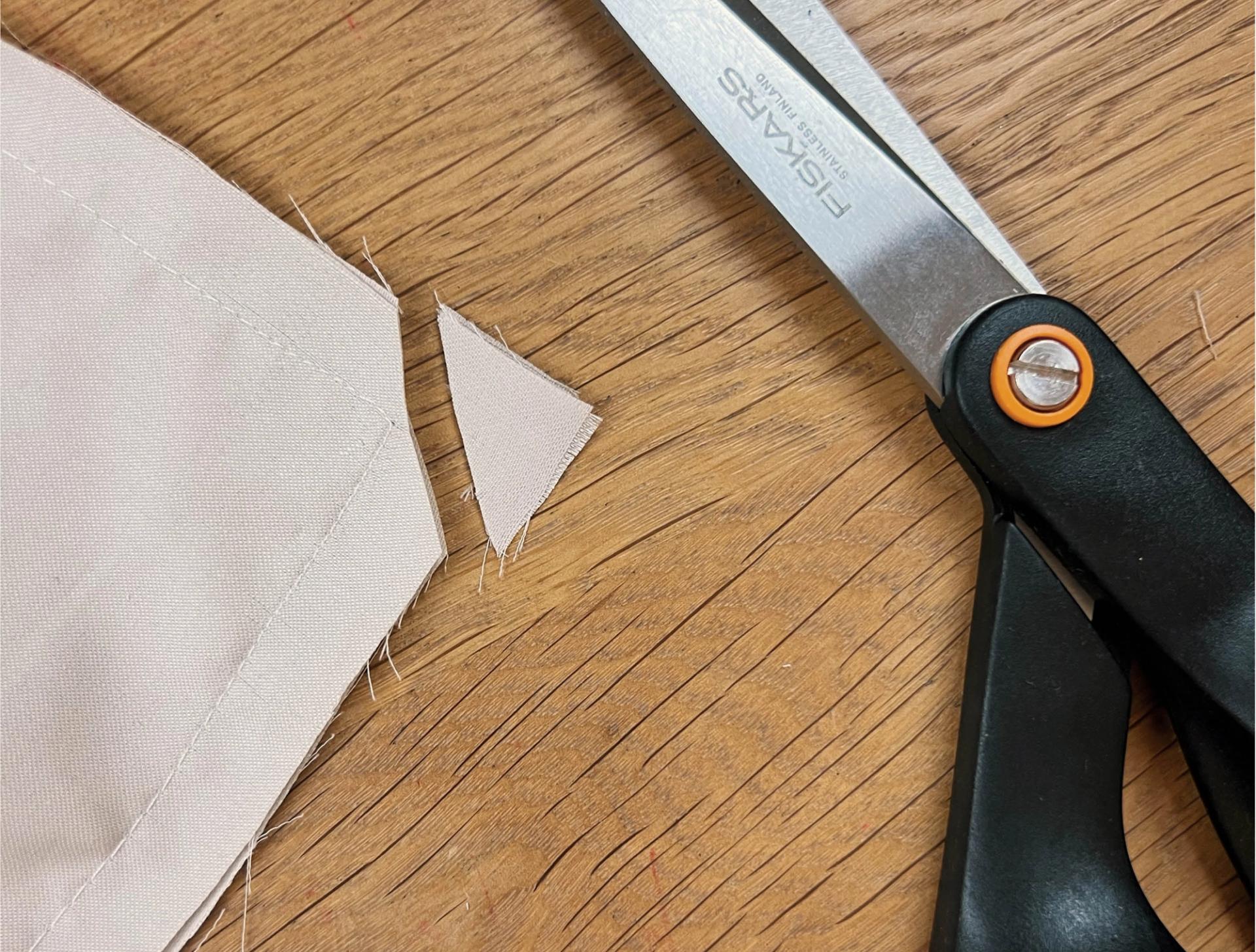 Klipp av hjørnene på innsiden. Da blir det enklere å få de fine og skarpe når man vrenger trekket.