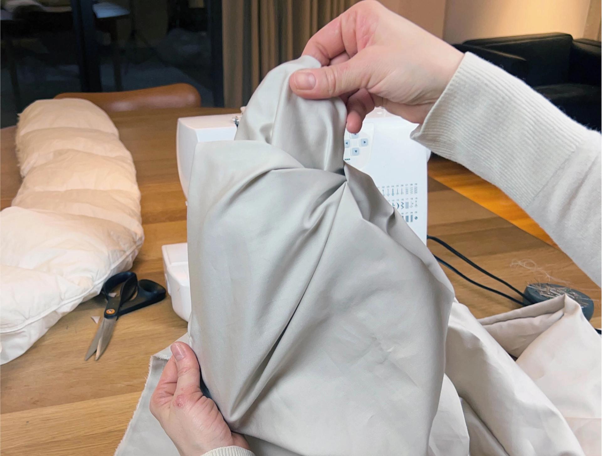 Unngå å sy igjen 20 cm på midten av en av langsidene. Denne åpningen trenger vi for å vrenge og putte inn dunskjerfet.