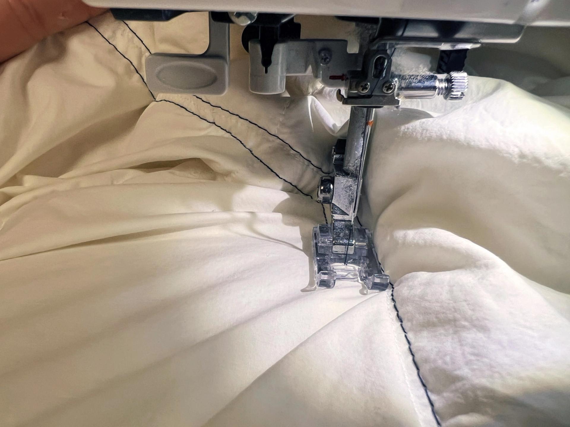 For at dunen ikke skal lekke når du klipper i skjerfet må du sy to sømmer og klippe mellom sømmene. Sy to parallelle sømmer der du ønsker å klippe for passende størrelse på skjerfet. Det kan være lurt å sy der det allerede er en søm, da blir det lettere å sy rett.