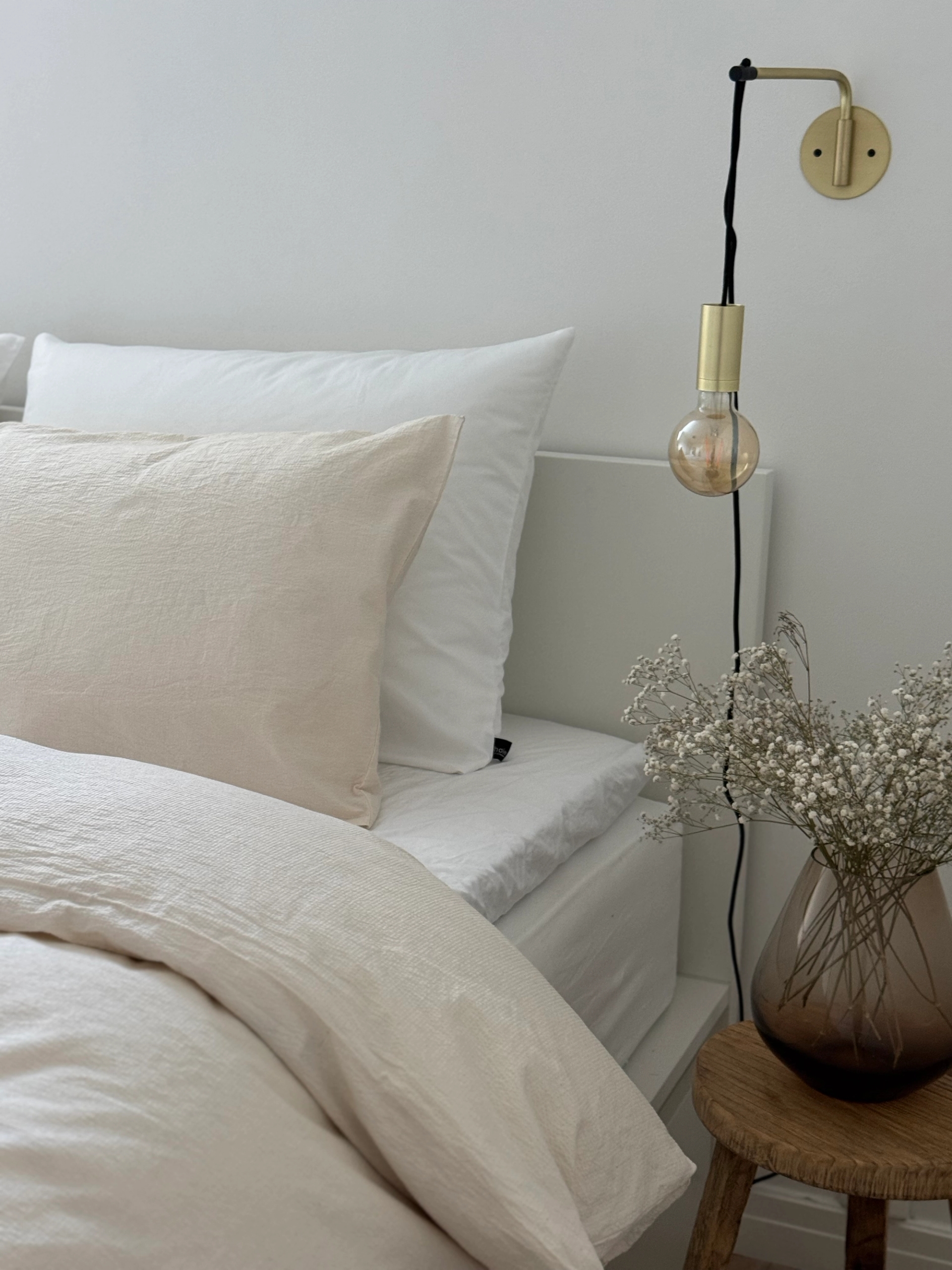 Når det kommer til sengetøy, sverger begge til favoritter med både komfort og stil. Synnøve er trofast krepp-fan og har et nostalgisk forhold til det stripete kreppsengetøyet hun hadde som barn – nå er Ara ubleket hennes klare favoritt.